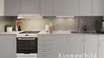 Köksluckor, handtag, bänkskiva, källsortering med tillhörande kärl, bänkskåpsinsats samt dämpning på luckor och lådor. Bänkprofil i aluminium monteras på bänkskivans kant mot spisen där det är tekniskt möjligt samt utvändig stommålning.